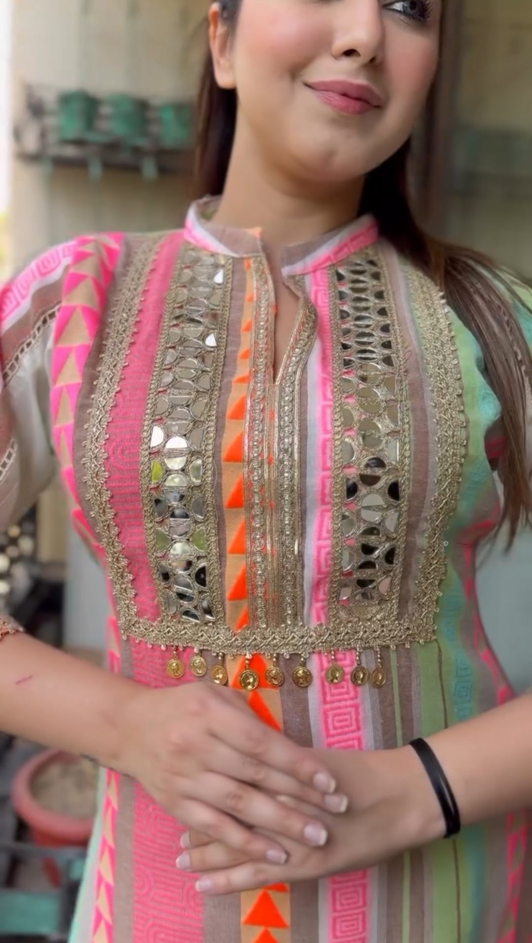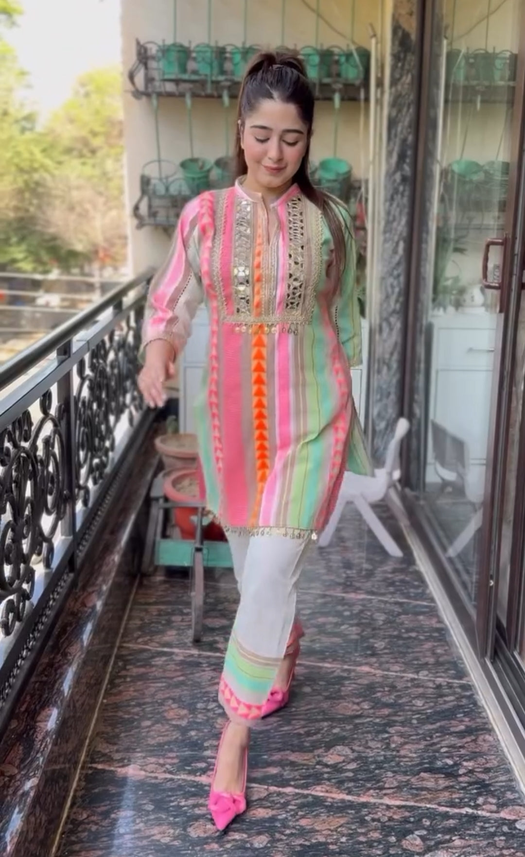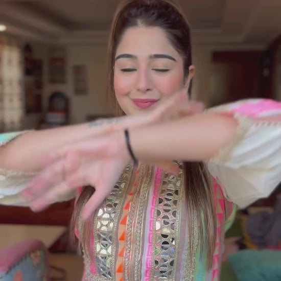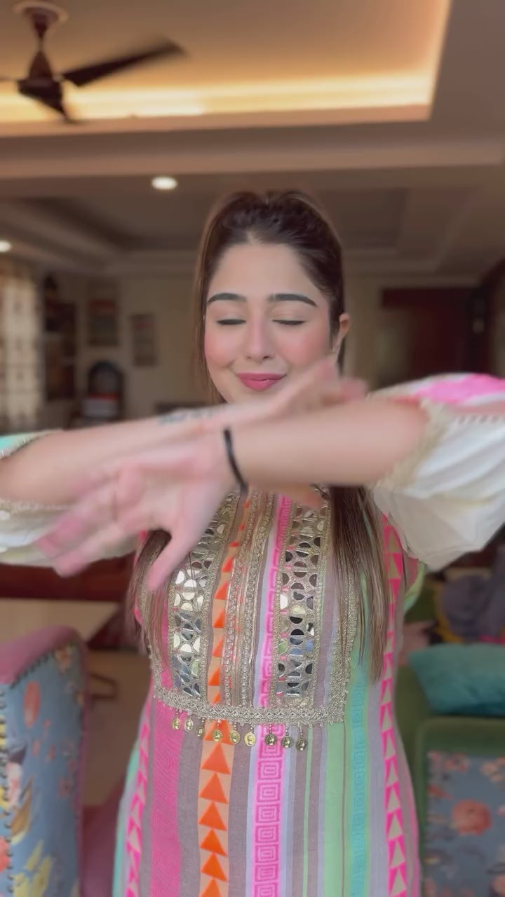 Step into effortless elegance with this pastel mirror-work ethnic wear cordset, perfect for festive outfits, wedding functions, and all kinds of occasion wear. The soft pastel stripes and premium detailing make it a stylish and comfortable wedding outfit alternative for daytime events, brunches, and celebrations.